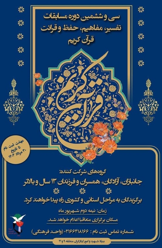 به گزارش مدیریت دانشجویان شاهد و ایثارگر دانشگاه علوم پزشکی تهران، مرحله شهرستانی(منطقهای) سی و ششمین دوره مسابقات قرآن کریم ویژه خانواده شاهد و ایثارگر در رشته معارف قرآن کریم(تفسیر)، ترجمه عمومی(مفاهیم)، حفظ ۵، ۱۰، ۲۰ و کل و رشته قرائت تحقیق، شهریورماه سال جاری برگزار میشود.