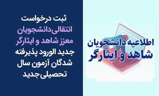 دانشجویان شاهد و ایثارگر پذیرفته‌شده در آزمون سراسری ۱۴۰۵–۱۴۰۴ تا 3 آبان‌ماه فرصت دارند درخواست انتقال خود را در سامانه انتقال شاهد و ایثارگر ثبت کنند.